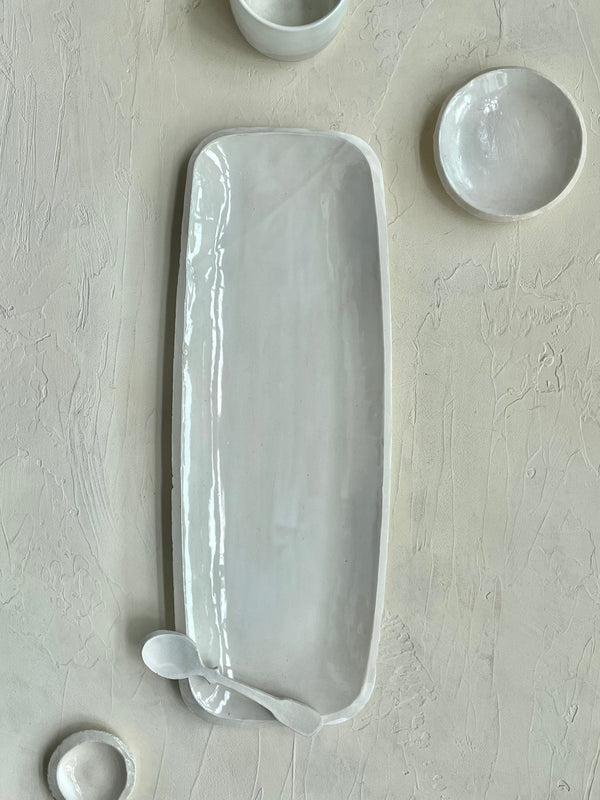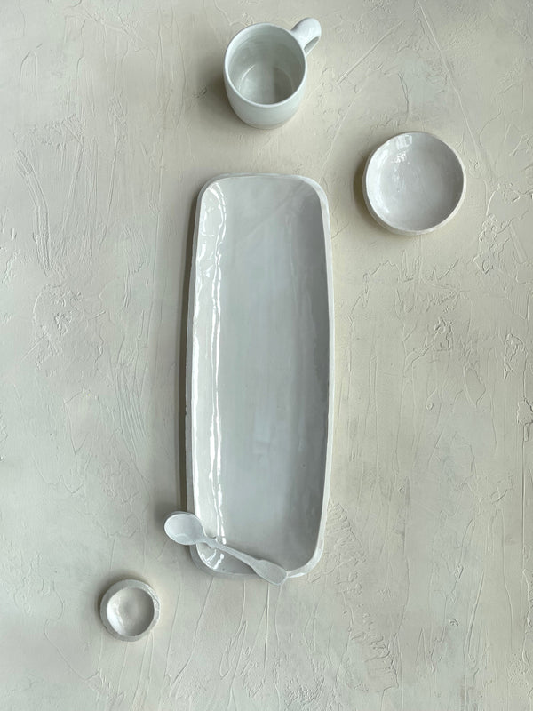 This is our Elongated Serving Platter, perfect for hosting when counter space is tight. We also love it for daily living on the kitchen counter, holding essentials for your daily coffee ritual or most loved seasonings. This little guy will slip into any full countertop like a champ.