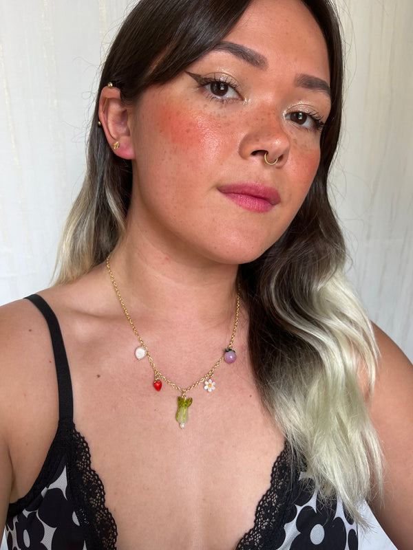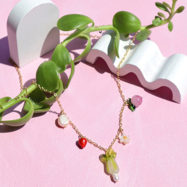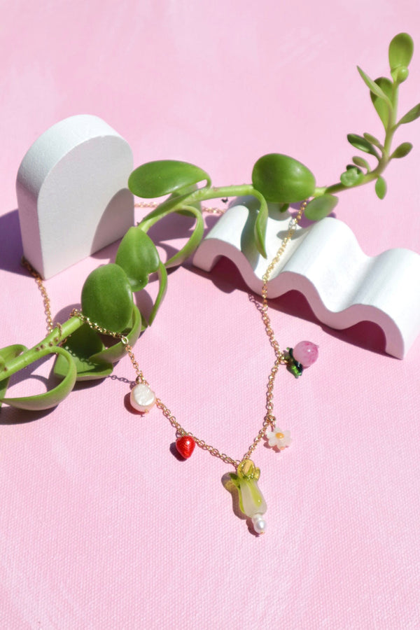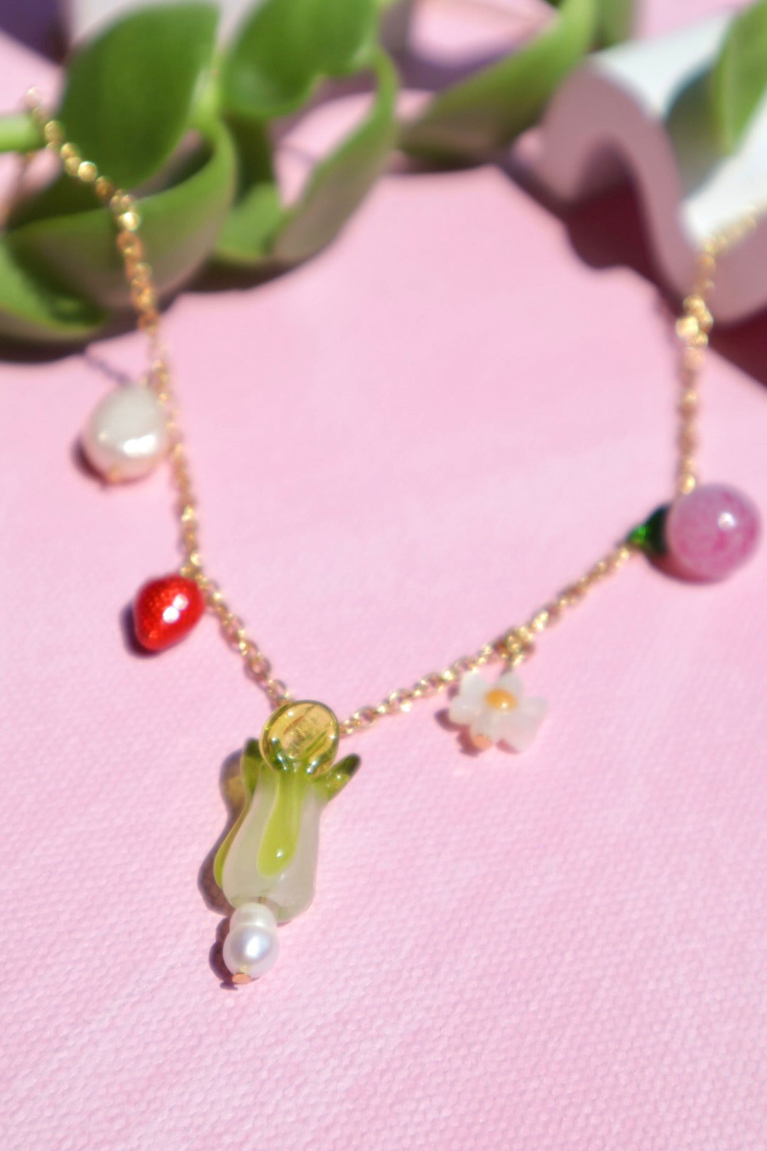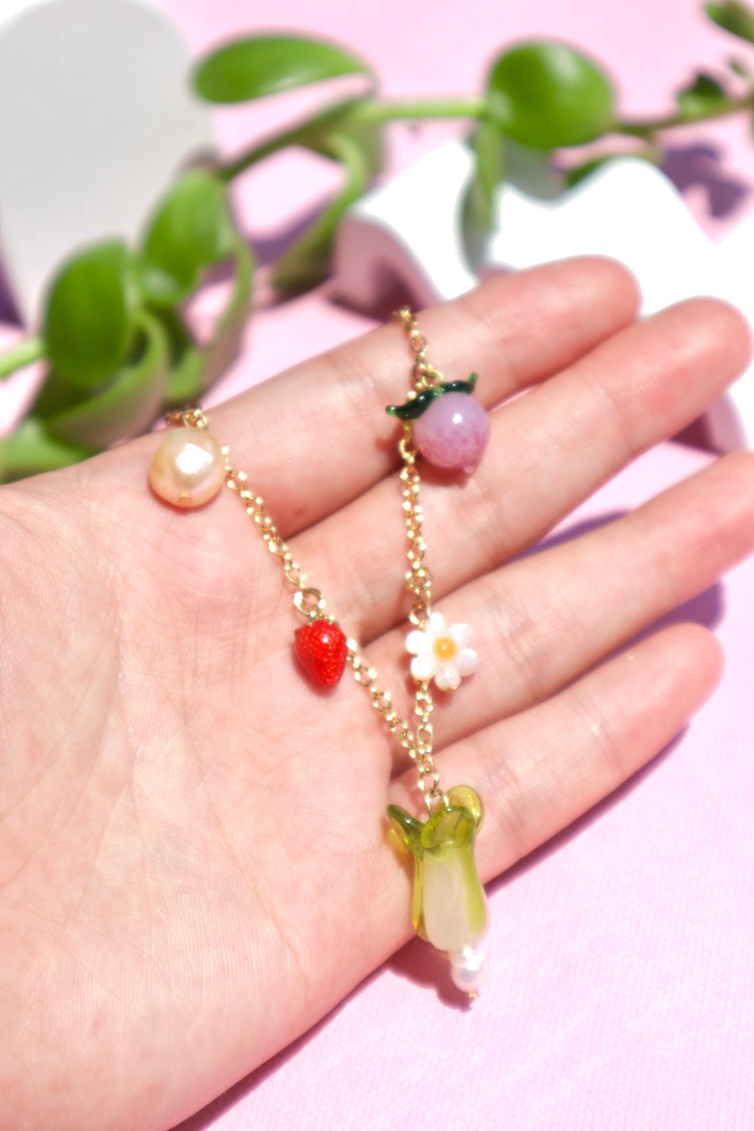 Complete your look with the Bento Picnic Necklace! This unique accessory features a colorful charm necklace with a glass nappa cabbage, strawberry, peach, flower, and freshwater pearl charms, crafted to give your outfit an extra touch of charm.